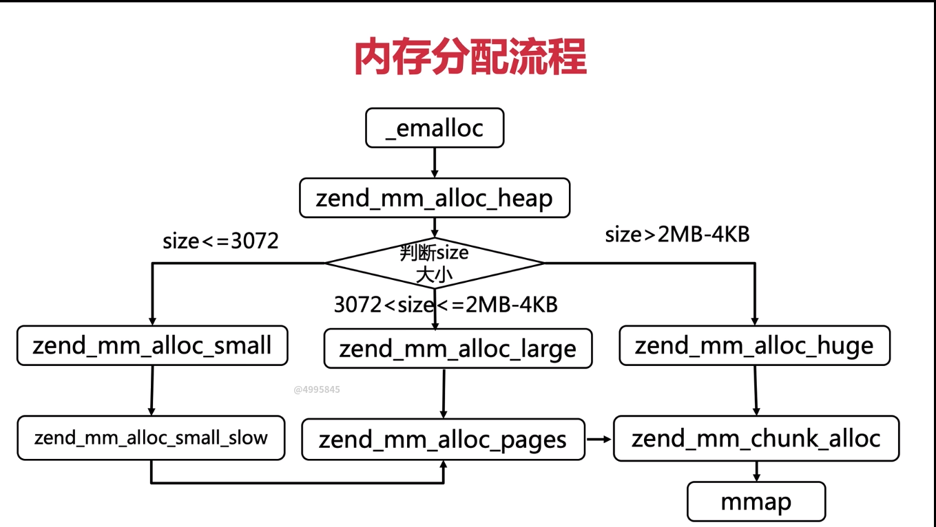 申请内存小于等于 3K, 则属于 small, 执行 zend_mm_alloc_small 函数, 如果当前有 small 内存, 则直接返回, 如果没有, 则执行 zend_mm_alloc_small_slow, 需要先去 zend_mm_alloc_pages 看看, 如果 large 也没有余量了, 就去 zend_mm_chunk_alloc 开辟新的内存。