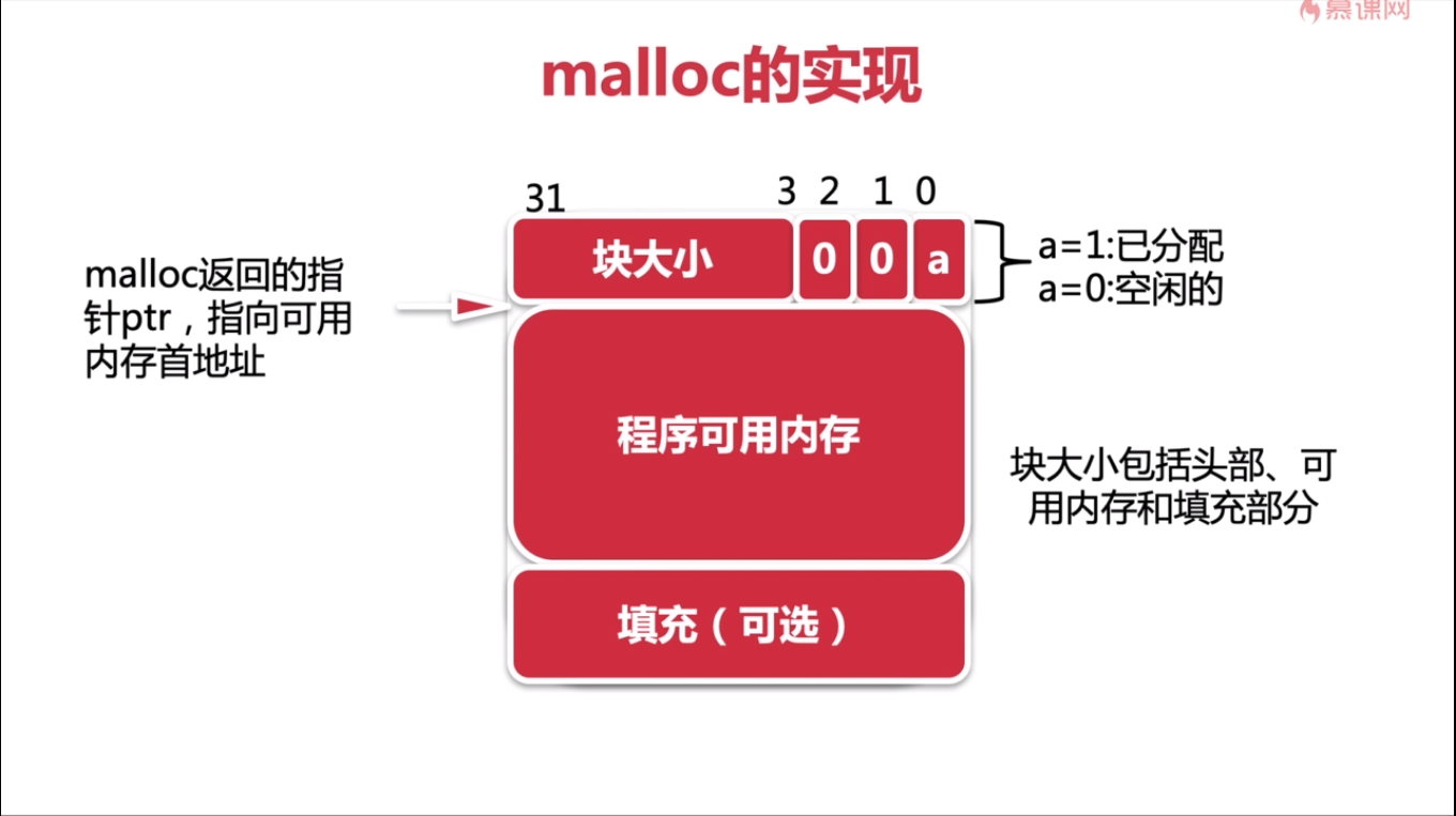 当 free 的时候,会向前搜寻 32 的头,取高 29 位为块的大小,所以 free 的时候就不需要传递 size 了,当然这只是一种 malloc 的实现,当前的 linux 的 malloc 事件已经不是这样了,但原理是一样的,也是维护了一个头部。